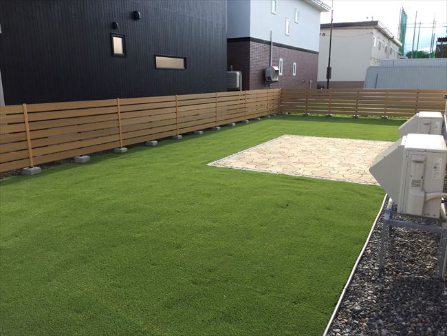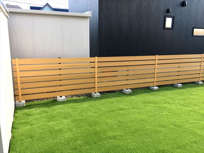 外からの目線が気にならないお庭がご希望という事でしたので、メンテナンスフリーな人工木を使ったフェンスを設置しました。