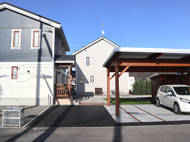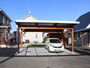 カーポートを木製ワイドタイプにし、物置も木製のものを設置しました。