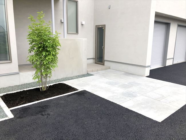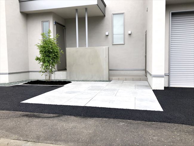 玄関前も同じコンクリート平板を組み合わせたシンプルながらも存在感のある外構となりました。