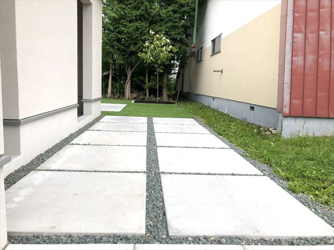 コンクリート平板をふんだんに使い住宅にマッチした外構を意識しました。