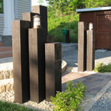 手入れの必要がない人工木フェンスを設置し物置までのアプローチを枕木風のコンクリート製品で仕上げました。