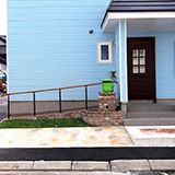 玄関のアプローチを自然の石を使用して、色合も家に合わせてピンク色を使用しました。 お客様も大まんぞく。