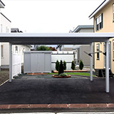 駐車スペースはアスファルト舗装でアルミのカーポート2台用を設置し、南側には人工木デッキと人工芝、そしてカルムぺイブでテラスを設置しました。