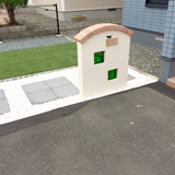 表札を設置する塀はガラスブロックを追加して柔らかさを演出しました。人工芝もあり落ち着いた雰囲気のお庭に仕上げました。