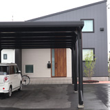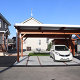 住宅の雰囲気にぴったりあうよう、玄関前はすっきりとしたデザインになりま した。カーポートを木製ワイドタイプにし、物置も木製のものを設置しました。