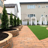 南側のお庭に道内産の中性レンガでアプローチを作りソイルレンガのサークル間には人工芝でフリースペースを作りました。
