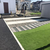 新色の石を使った花壇、使い勝手の良いコンクリート平板、手入れのいらない人工芝を敷いたドッグランフェンスで使い勝手の良いお庭に